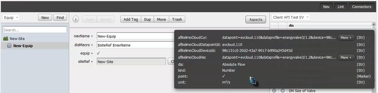 Once the connector will be active, SkySpark will have access to all the information offered by the Belimo Cloud for every device visible to the user you will configure. |